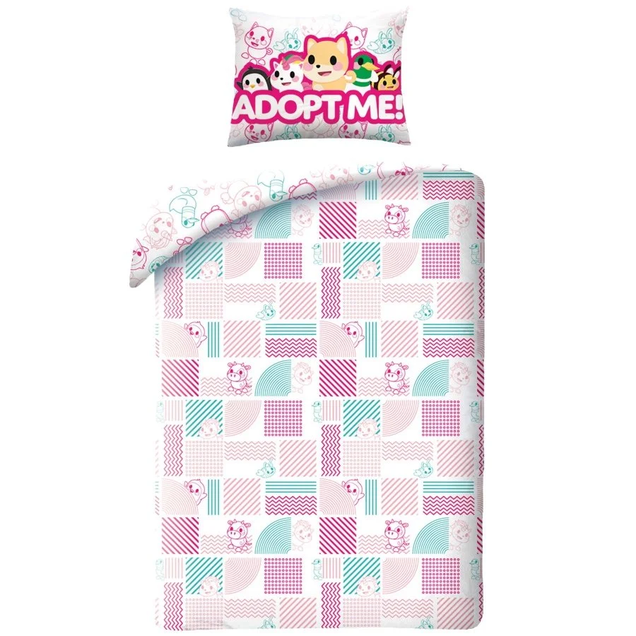 Souprava ložního povlečení Adopt Me! Adopt Me! je oblíbená masivně multiplayerová online videohra na platformě Roblox. Lícní stranu povlaku na přikrývku zdobí roztomilé obrázky mazlíčků k adopci a nápisy "Hello", "Love" a "Hugs", což v překladu znamená "Ahoj", "Láska" a "Objímání". Druhá strana je pokryta obrázky mazlíčků a dlaždicemi s geometrickými vzory. Povlak na polštář ladí s přikrývkou a navíc je ozdoben logem Adopt Me! Tato stylová souprava je ideálním dárkem pro všechny fanoušky Robloxu a hráče Adopt Me!