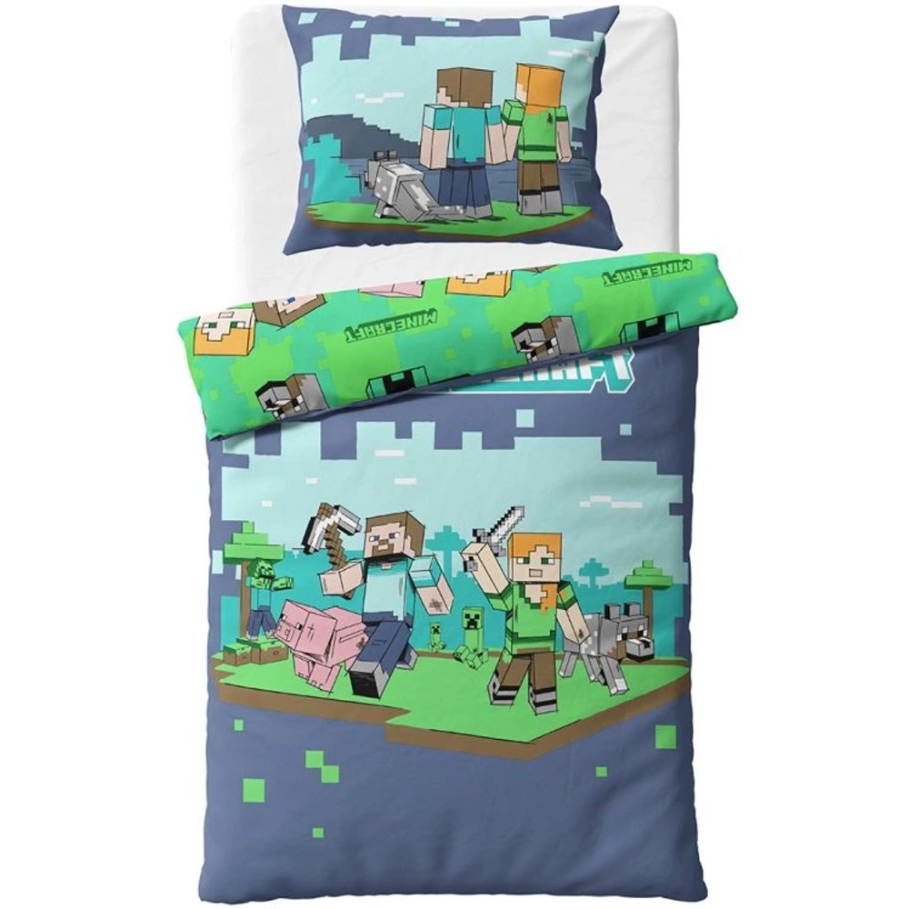 Souprava ložního povlečení Minecraft s motivem Alex a Steve promění každý dětský pokoj v herní dobrodružství. Vyrobeno ze 100% hladké bavlny. Rozměry 140×200 cm + 70×90 cm, zipové zapínání. Certifikát Oeko-Tex Standard 100.