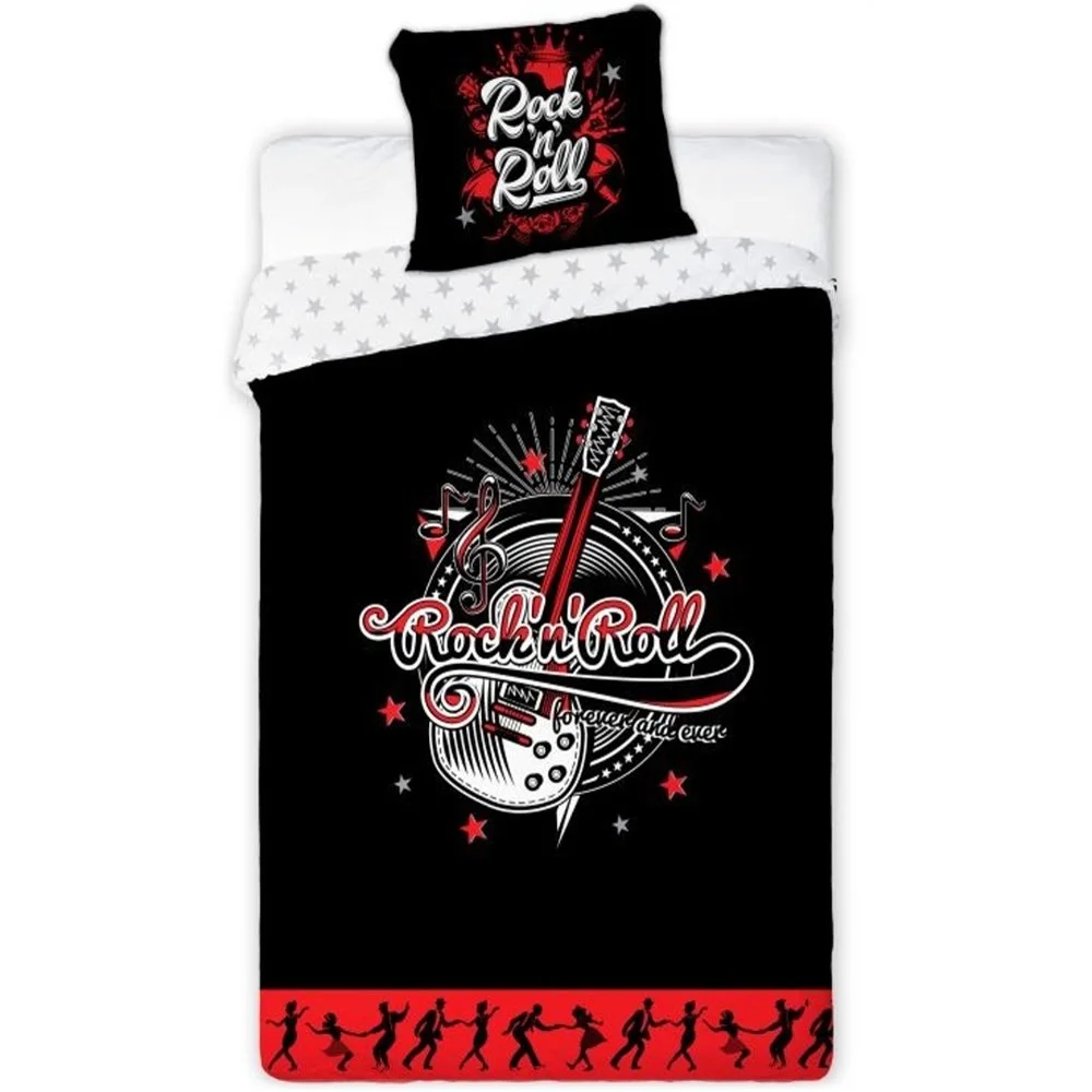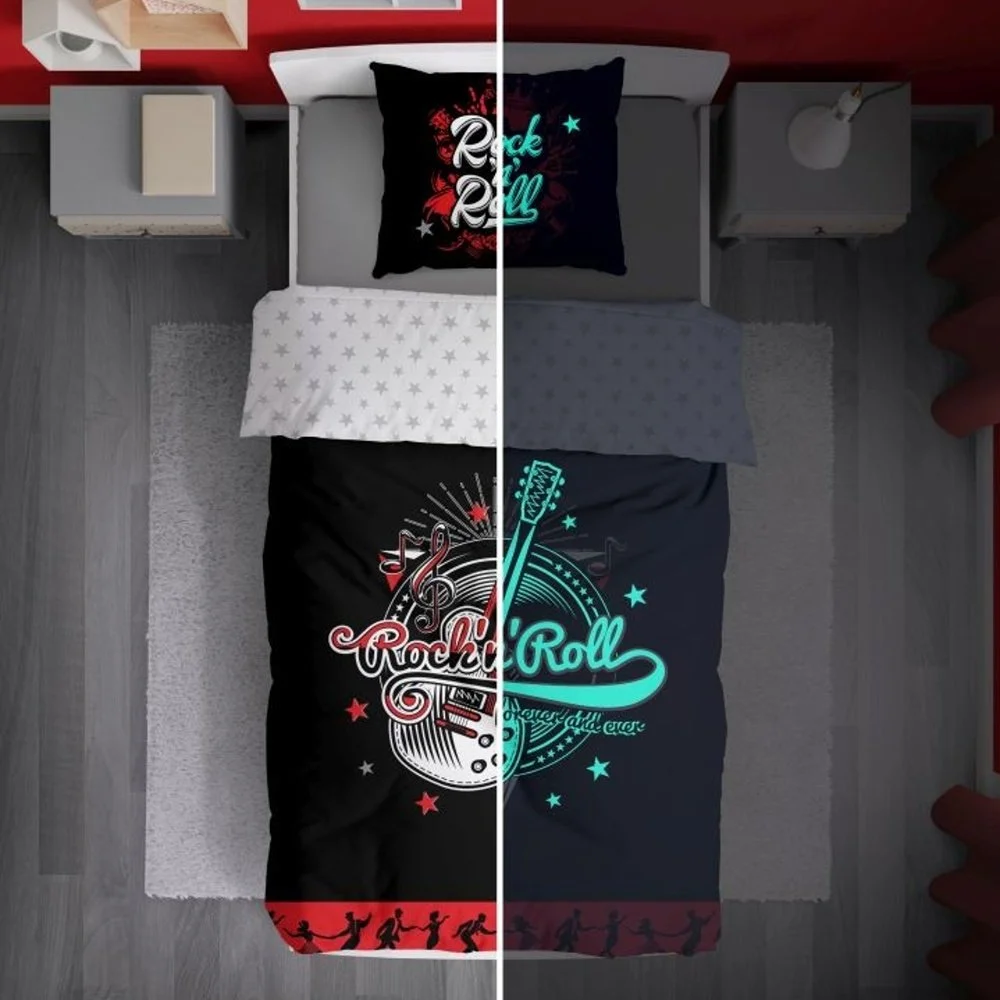Oboustranné bavlněné povlečení s motivem Rock and Roll a světélkujícím efektem. Rozměr 140×200 cm + 70×90 cm, zapínání na zip. Certifikace MADE IN GREEN by OEKO-TEX®.