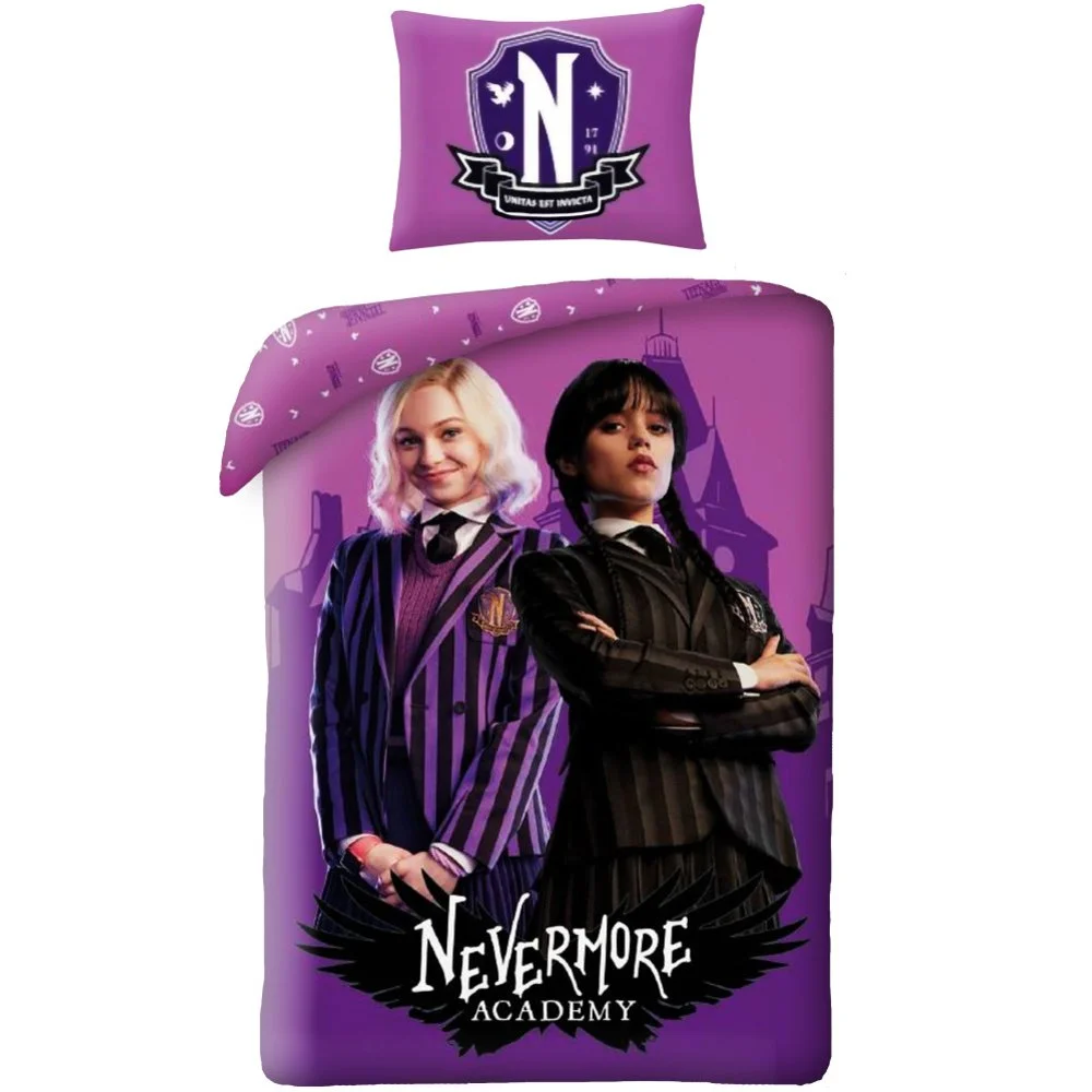 Souprava ložního povlečení Wednesday – motiv Nevermore Academy. Je vyrobena z jemného polyesterového mikrovlákna. Tato tkanina je měkká, hladká na dotek a skvěle odvádí vlhkost. Rozměry 140×200 cm a 70×90 cm, zapínání na zip.
