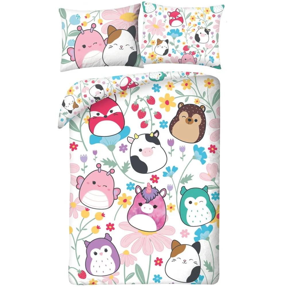 Souprava ložního povlečení Squishmallows – motiv Flower Friends. Je vyrobena z jemného polyesterového mikrovlákna. Tato tkanina je měkká, hladká na dotek a skvěle odvádí vlhkost. Rozměry 140×200 cm a 70×90 cm, zapínání na zip.