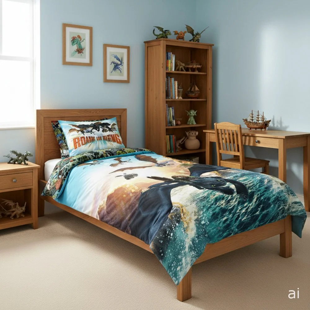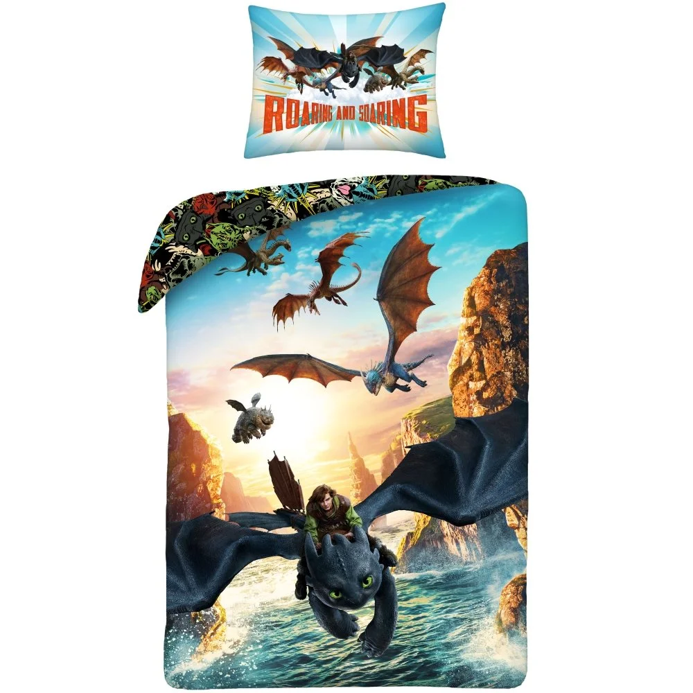 Souprava ložního povlečení Jak vycvičit draka - motiv Roaring and Soaring. Je vyrobena z jemného polyesterového mikrovlákna. Tato tkanina je měkká, hladká na dotek a skvěle odvádí vlhkost. Rozměry 140×200 cm a 70×90 cm, zapínání na zip.