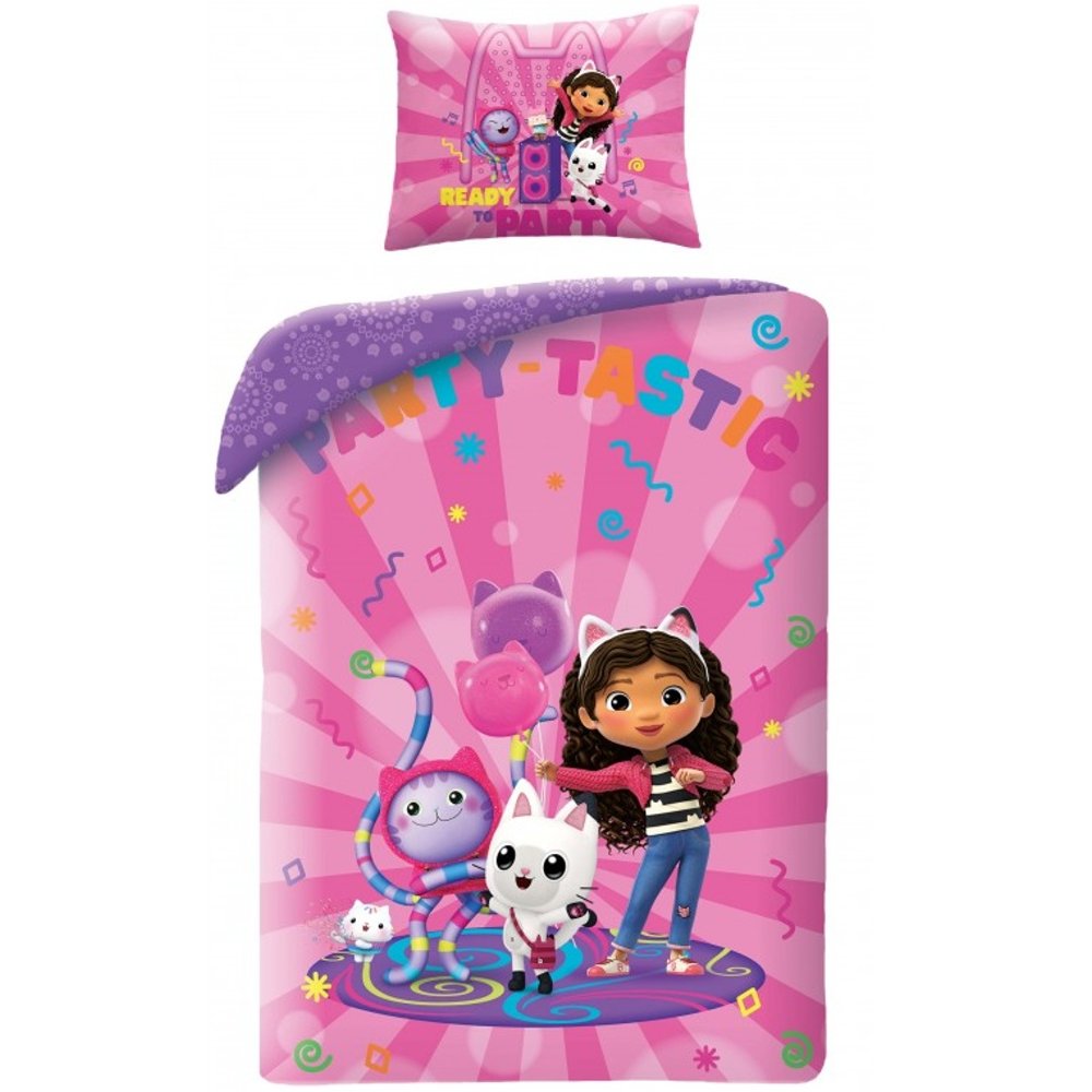 Souprava ložního povlečení Gabby's Dollhouse - motiv Party Tastic. Je vyrobena z jemného polyesterového mikrovlákna. Tato tkanina je měkká, hladká na dotek a skvěle odvádí vlhkost. Rozměry 140×200 cm a 70×90 cm, zapínání na zip.