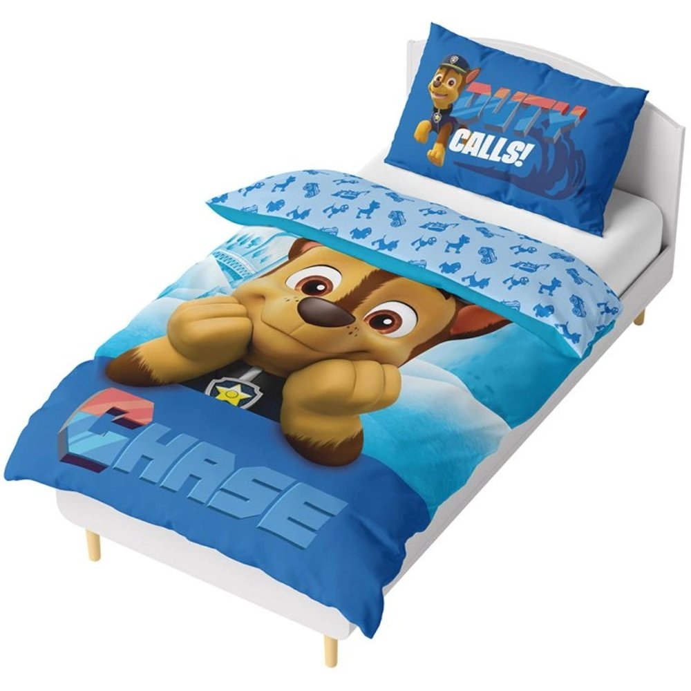 Více o produktuLožní povlečení Tlapková patrola s motivem policisty Chase potěší všechny malé fanoušky tohoto oblíbeného hrdiny. Lícní stranu povlaku na přikrývku zdobí velký veselý portrét Chase v jeho typické policejní uniformě, doplněný modrým zimním pozadím. Rubová strana má světle modrý podklad s opakujícím se vzorem Chase, odznaků a policejních symbolů, takže působí hravým a veselým dojmem. Povlak na polštář je z obou stran stejný a zdobí jej obrázek Chase s výrazným modrým nápisem DUTY CALLS!, který ladí s hlavním motivem na přikrývce.