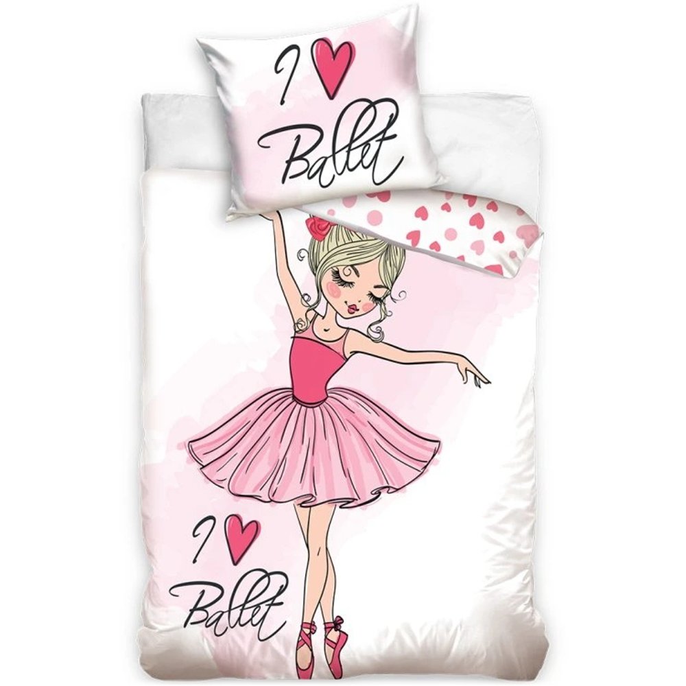 Více o produktuToto povlečení dodá každému dívčímu pokojíčku něžně kouzelnou atmosféru. Povlak na přikrývku zdobí motiv s baletkou na mlhavě růžovém podkladu, zatímco druhá strana je poseta drobnými růžovými srdíčky na bílém pozadí. Povlak polštáře je z obou stran stejný a je na něm nápis I love balet, tedy česky Miluji balet.
