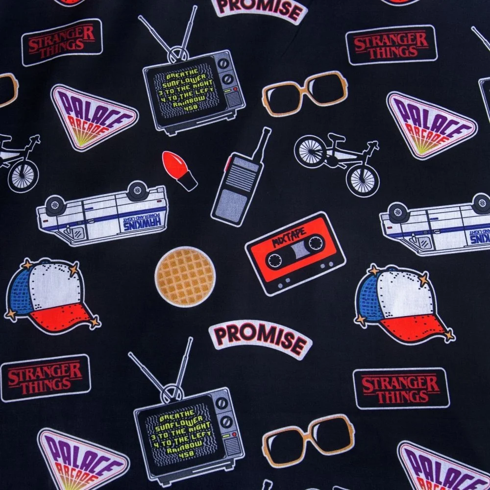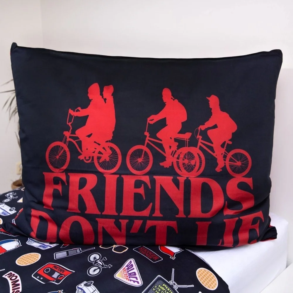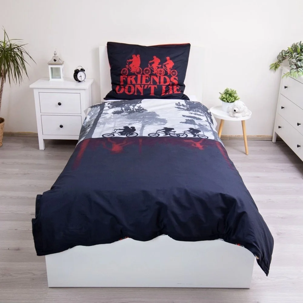 Více o produktuLožní povlečení Stranger Things s motivem světa Upside Down potěší všechny fanoušky tohoto oblíbeného seriálu. Lícní stranu povlaku na přikrývku zdobí působivý motiv siluet postav na kolech v lesní krajině, pod nimiž se zrcadlí temný svět Upside Down. Celý design působí tajemně a dobře vystihuje napínavou atmosféru seriálu. Rubová strana přikrývky je tmavá a zdobí ji drobný opakující se vzor inspirovaný seriálem, například televizory, kazetami, vysílačkami, koly nebo nápisy Stranger Things a Palace Arcade. Na povlaku na polštář je z jedné strany výrazný nápis Stranger Things na červeném podkladu, druhou stranu zdobí motiv postav na kolech s hláškou Friends Don’t Lie, tedy "Přátelé nelžou". Povlečení je vyrobeno ze 100% bavlny a má praktické zapínání na zip. Sada obsahuje 1x povlak na přikrývku o rozměru 140x200 cm a 1x povlak na polštář 70x90 cm.