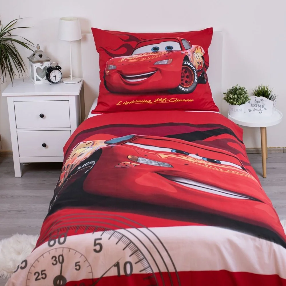 Souprava ložního povlečení Auta s motivem legendárního Bleska McQueena. Je vyrobena ze 100% bavlny, má zapínání na zip a certifikát OEKO-TEX. Obsahuje 1x povlak na přikrývku 140x200 cm a 1x povlak na polštář 70x90 cm, je tedy vhodná pro standardní velkou postel.