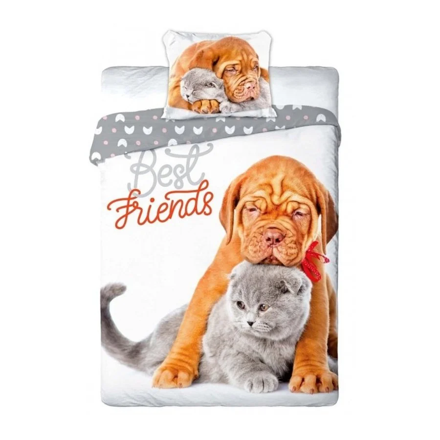 Ložní povlečení Best friends. Toto oboustranné povlečení je vyrobeno ze 100% bavlny. Přední stranu přikrývky a polštář zdobí obrázek nejlepších přátel pejska a kočky, zadní strana povlaku přikrývky je šedá s bílo / růžovým vzorem. Toto povlečení dodáváme v rozměru povlaku na přikrývku 140 x 200 cm a povlaku na polštář 70 x 90 cm.
