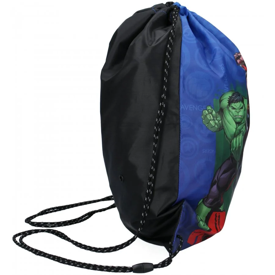 Pytlík na přezůvky / sportovní vak na záda Avengers - MARVEL. Jednu stranu zdobí obrázek komiksových superhrdinů z týmu Avengers. Rubová strana je jednobarevná - černá. Díky uchycení šňůrek i ve spodních rozích lze tento vak nosit i na zádech. Je ideální do školy, či do školky jako sáček na papuče, věci do tělocviku, nebo na výtvarku, či jako vak na záda třeba na výlet. Jeho rozměry jsou cca 44 x 37 cm.