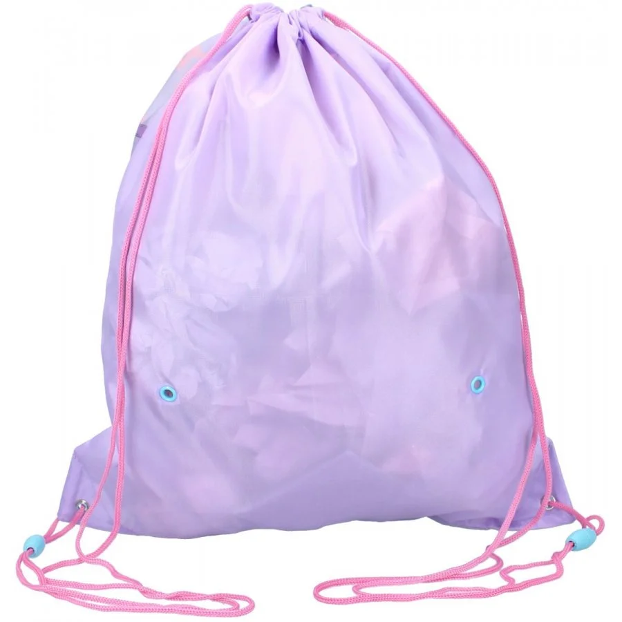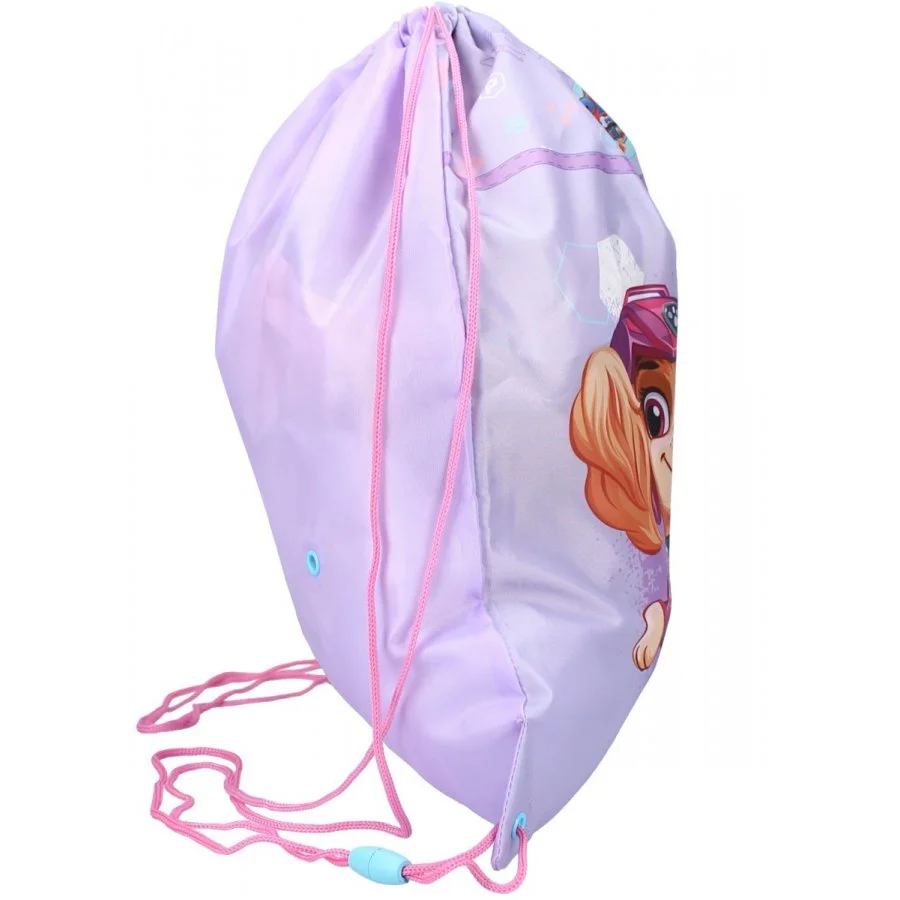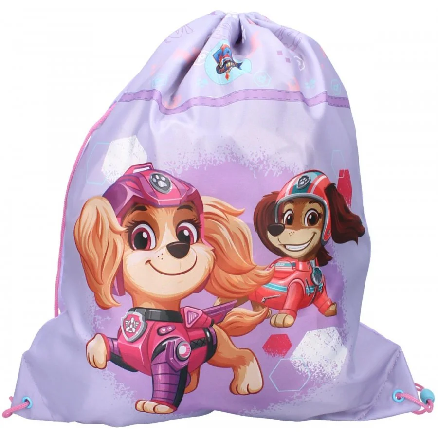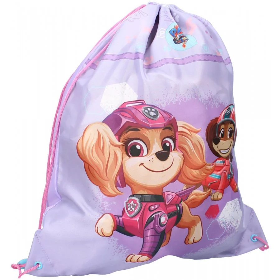 Pytlík na přezůvky / sportovní vak na záda Tlapková patrola ve filmu - Paw Patrol: The Movie. Jednu stranu zdobí obrázek psích slečen Skye a Zumy. Rubová strana je jednobarevná - fialková. Díky uchycení šňůrek i ve spodních rozích lze tento vak nosit i na zádech. Je ideální do školy, či do školky jako sáček na papuče, věci do tělocviku, nebo na výtvarku, či jako vak na záda třeba na výlet. Jeho rozměry jsou cca 44 x 37 cm.