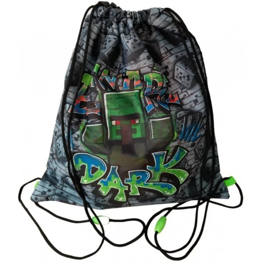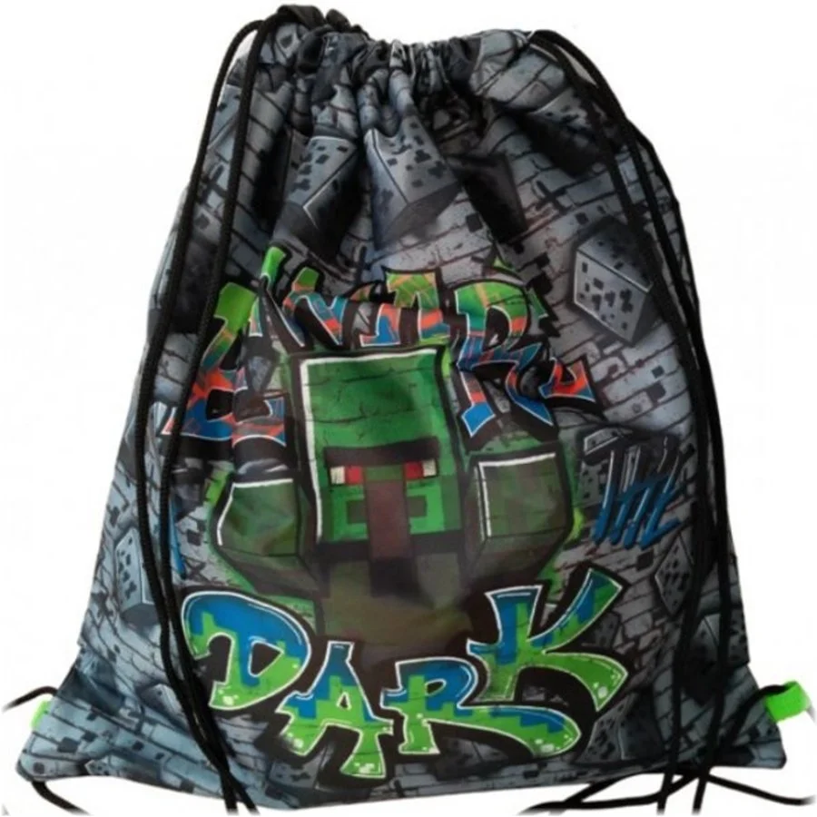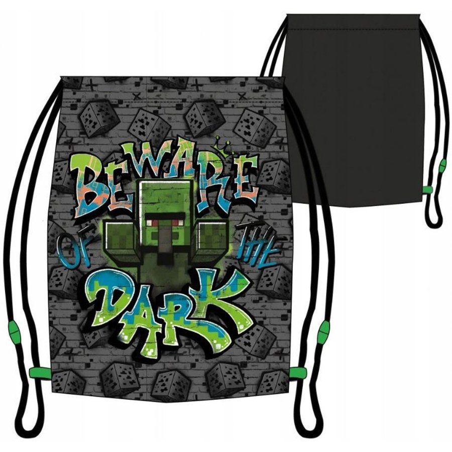 Pytlík na přezůvky / sportovní vak na záda Minicraft - motiv Beware of The Dark - oficiální produkt Mojang. Jednu stranu zdobí známý motiv ze světa Minecraft, druhá strana je jednobarevná - černá. Díky uchycení šňůrek i ve spodních rozích lze tento vak nosit i na zádech. Je ideální do školy jako sáček na papuče, věci do tělocviku, nebo na výtvarku, či jako vak na záda třeba na výlet. Jeho rozměry jsou cca 32 x 37 cm.