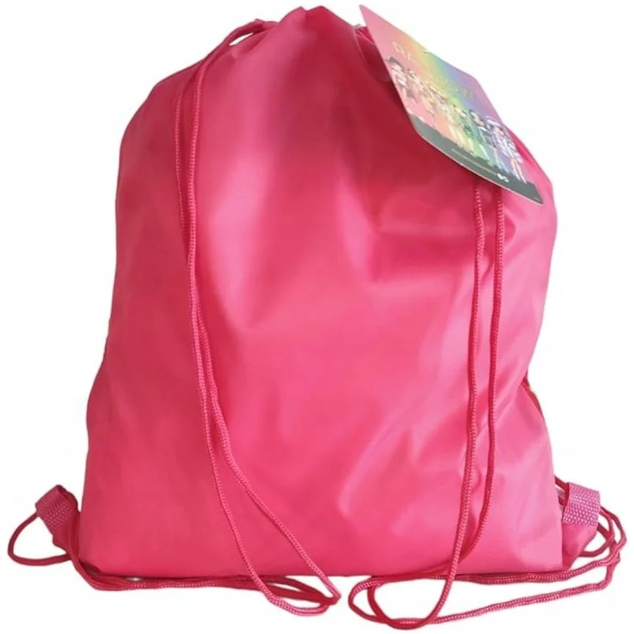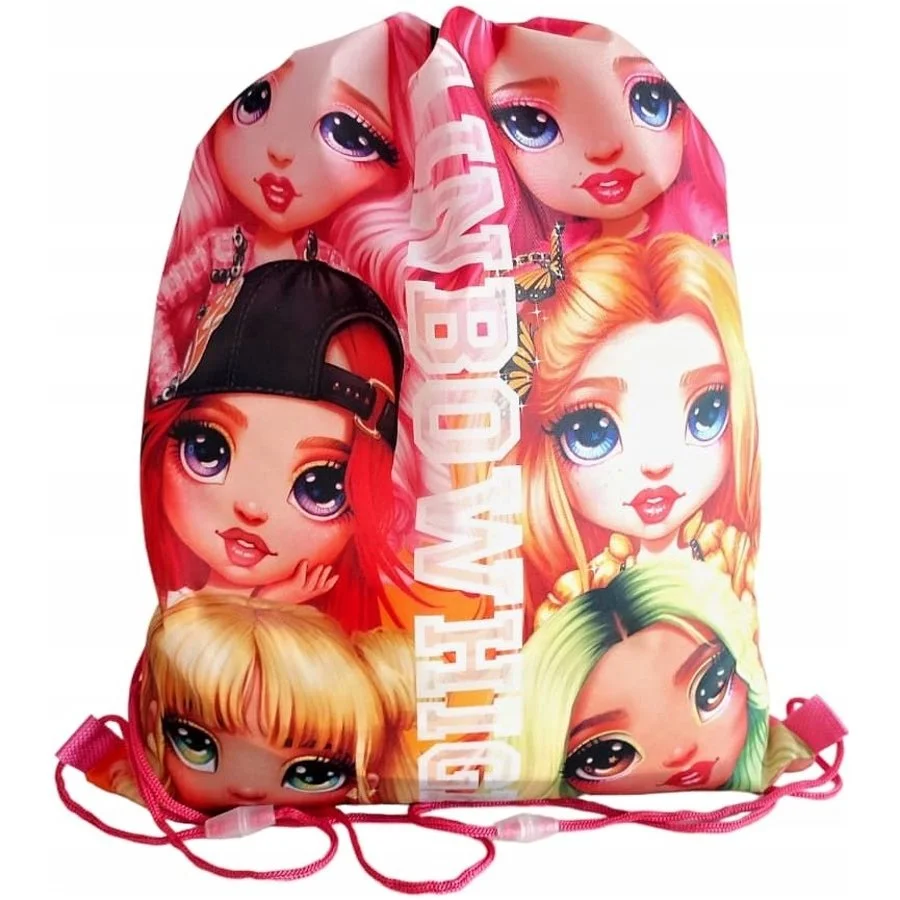 Školní pytlík na přezůvky / vak na záda Rainbow High. Z jedné strany ho zdobí obrázek barevných panenek s překrásnými barevnými účesy a k nim sladěným oblečením, z druhé strany je jednobarevný - růžový. Díky uchycení šňůrek i ve spodních rozích jej lze nosit ... Celý text