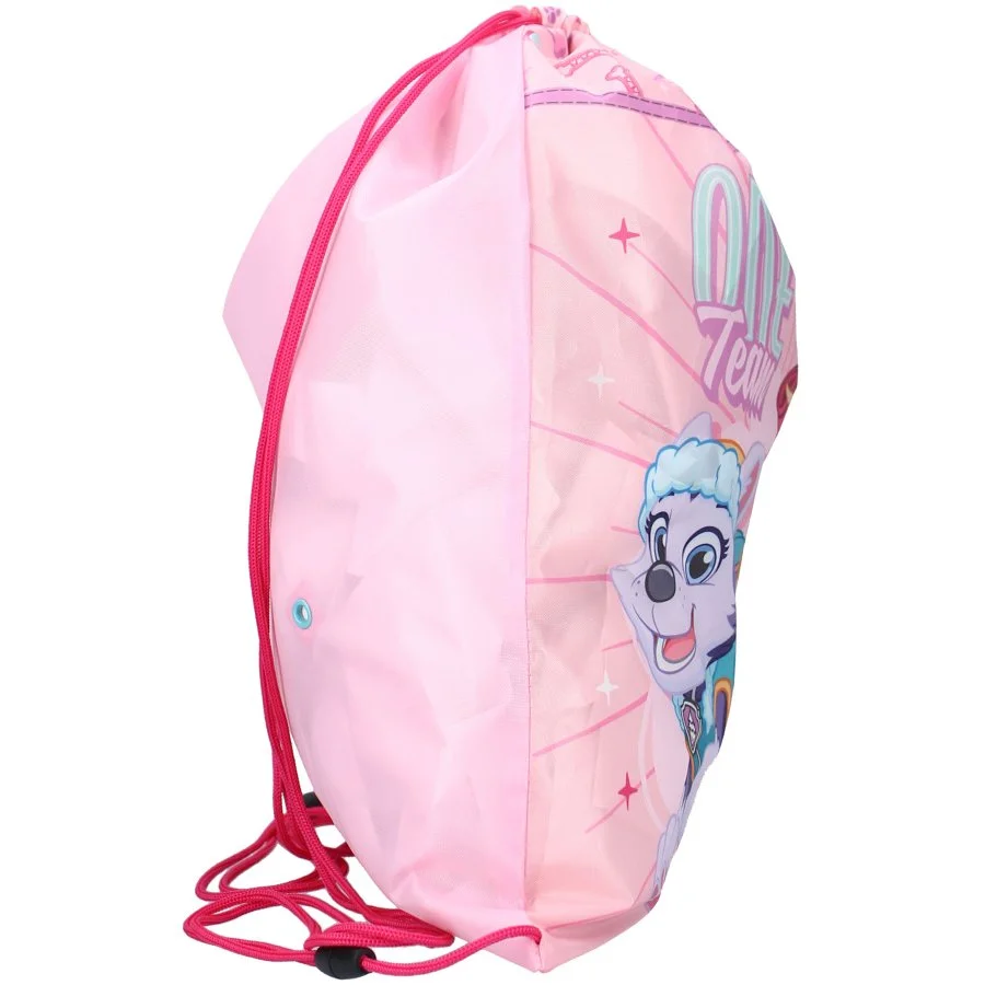 Pytlík na přezůvky / sportovní vak na záda Tlapková patrola - Paw Patrol. Jednu stranu zdobí obrázek psích slečen Skye a Everest. Rubová strana je jednobarevná - růžová. Díky uchycení šňůrek i ve spodních rozích lze tento vak nosit i na zádech. Je ideální do školy, či do školky jako sáček na papuče, věci do tělocviku, nebo na výtvarku, či jako vak na záda třeba na výlet. Jeho rozměry jsou cca 44 x 37 cm. Poslední obrázek u produktu znázorňuje poměr velikosti tohoto sportovního vaku ku postavě výšky 110 cm.