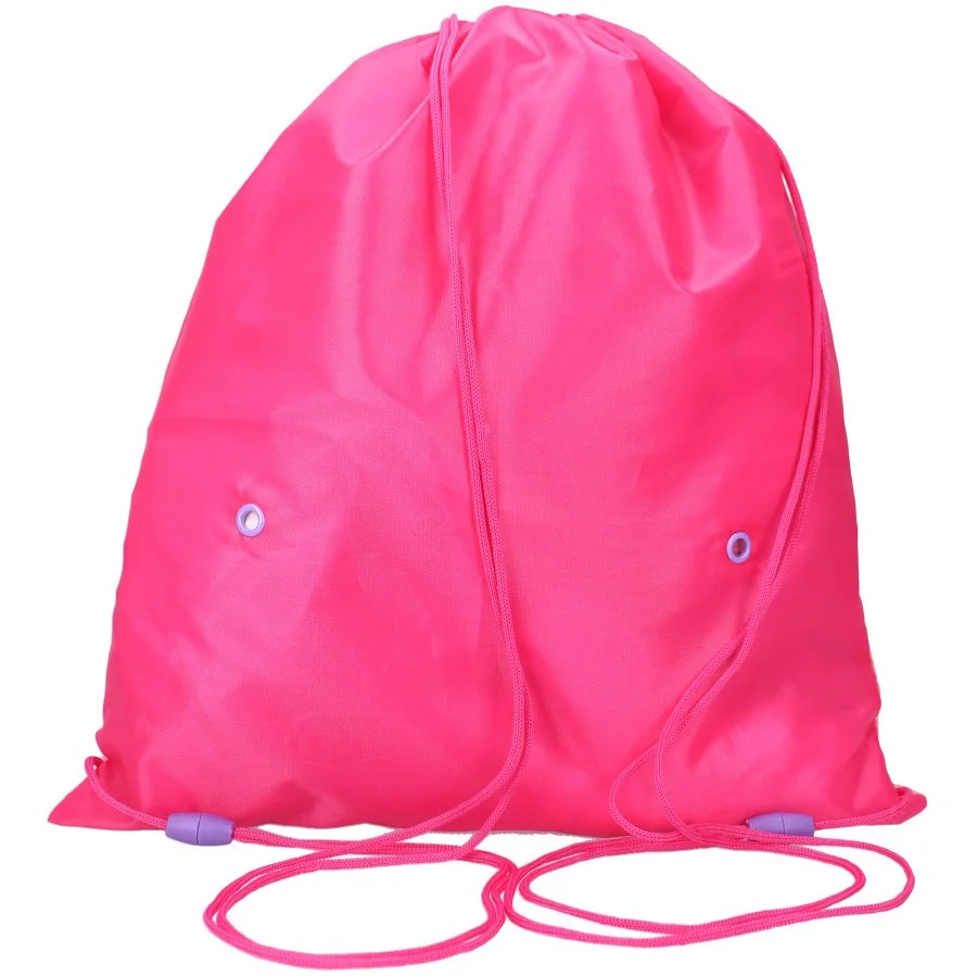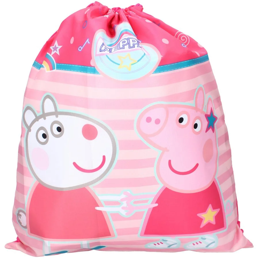 Pytlík na přezůvky / sportovní vak na záda Prasátko Peppa. Lícní stranu zdobí obrázek prasátka Pepiny a její kamarádky ovečky Suzy. Druhá strana je jednobarevná - růžová. Díky uchycení šňůrek i ve spodních rozích lze tento vak nosit i na zádech. Je ideální do školy, či do školky jako sáček na papuče, věci do tělocviku, nebo na výtvarku, či jako vak na záda třeba na výlet. Jeho rozměry jsou cca 44 x 37 cm. Poslední obrázek u produktu znázorňuje poměr velikosti tohoto sportovního vaku ku postavě výšky 110 cm.