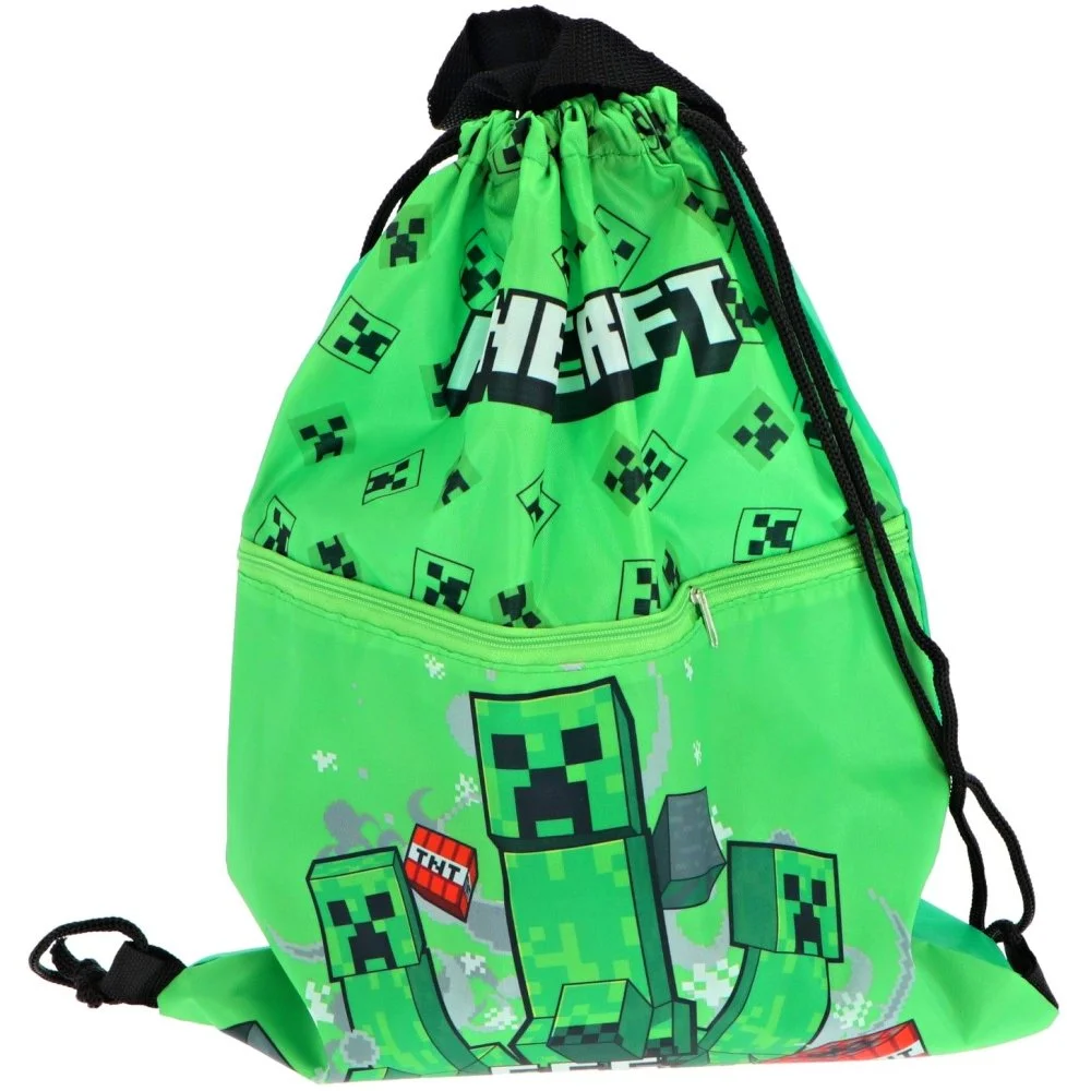 Dětský vak na záda Minecraft s motivem Creeperů, se zavíráním na šňůrky a praktickou přední kapsou na zip. Lze nosit na zádech i v ruce díky dvěma uchům. Ideální na tělocvik, přezůvky, výtvarku i výlety. Rozměr cca 44 × 34 cm.