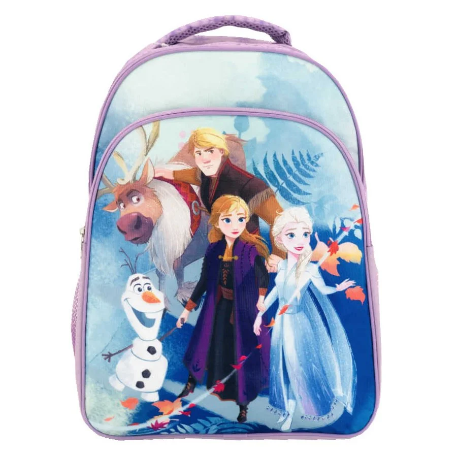Batoh do školy Ledové království - Frozen. Přední část zdobí obrázek přátel z Ledového království - princezen Anny a Elsy, sněhuláka Olafa, Kristoffa a soba Svena. Tento batoh má dva hlavní oddíly a navíc přední kapsu, všechny se zapínáním na zip. Popruhy na záda mají měkkou výstelku a jsou nastavitelné. Zadní část batohu je polstrovaná a je prodyšná, stejně jako ucho na nošení v ruce, nebo na zavěšení. Nechybí ani boční pružné síťky na nápoj, nebo jiné drobnosti. Rozměry tohoto batohu Ledové království jsou cca 40 x 30 x 15 cm.