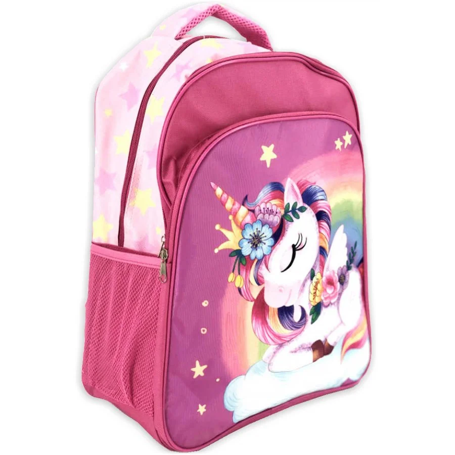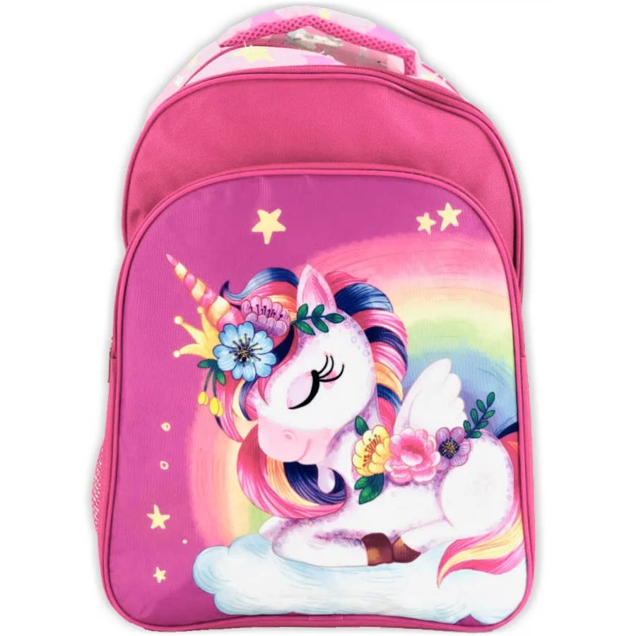 Batoh do školy motiv Jednorožec. Tento batoh má dva hlavní oddíly a navíc přední kapsu, všechny se zapínáním na zip. Popruhy na záda mají měkkou výstelku a jsou nastavitelné. Zadní část batohu je polstrovaná a je prodyšná, stejně jako ucho na nošení v ruce, nebo na zavěšení. Nechybí ani boční pružné síťky na nápoj, nebo jiné drobnosti. Rozměry tohoto batohu jsou cca 40 x 30 x 15 cm.