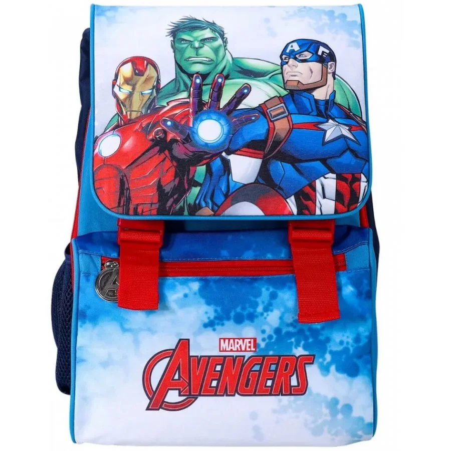 Dětský anatomický školní batoh Avengers - s obrázkem Kapitána Ameriky, Iron Mana a Hulka. Batoh má jednu hlavní kapsu rozdělenou přihrádkou. Hlavní kapsa má uzavírání stahovací šňůrkou a chlopní, která je zajištěna dvěma přezkami. Aktovka je dále vybavena přední kapsou se zavíráním na zip, třeba na svačinu, a boční pružnou síťkou na nápoj, nebo jiné drobnosti. Vyztužená záda jsou vyrobena z měkké pěny s odvětrávacími kanálky proti pocení. Popruhy na záda mají také měkkou výstelku s prodyšným povrchem a jsou nastavitelné. Nechybí ani ucho na nošení či zavěšení. Rozměry této klučičí aktovky Avengers jsou cca 42 x 32 x 22 cm, ale rozepnutím bočních zipů ji lze zvětšit až o 8 cm. Její hmotnost je pouhých 560 gr. Díky anatomicky tvarovaným zádům a nízké hmotnosti se pohodlně nosí.
