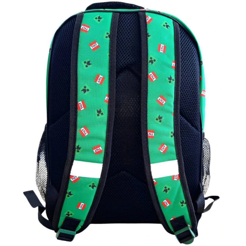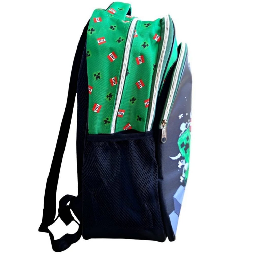Školní batoh s motivem Minecraft Creepers. Má dvě hlavní komory a přední kapsu na zip, boční síťky na pití, nastavitelné popruhy a polstrovaná záda. Rozměr 42 × 32 cm.