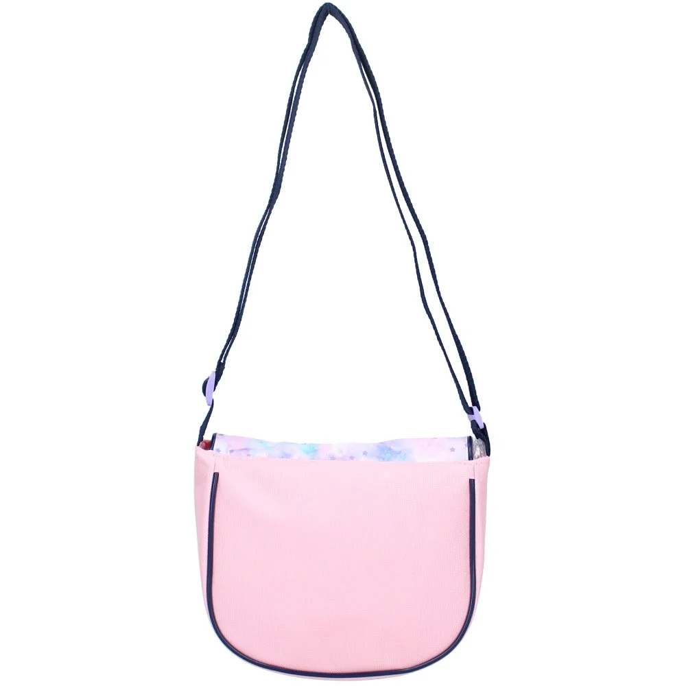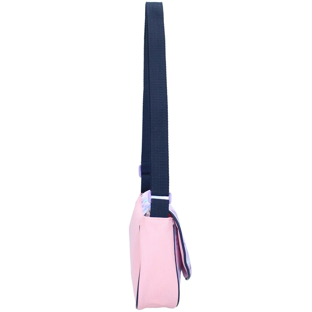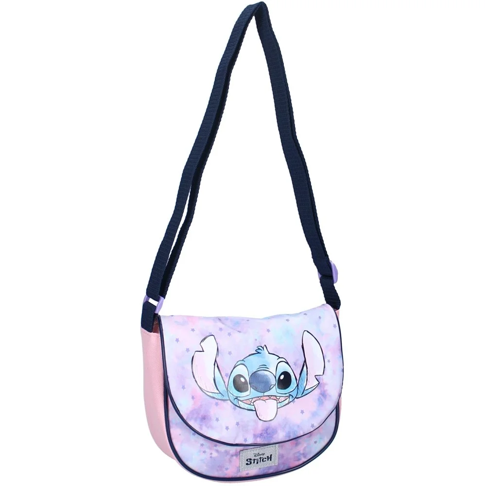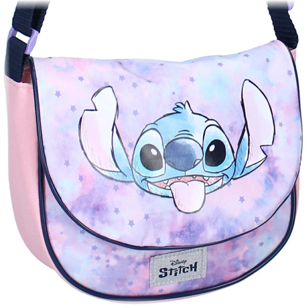 Stylová dívčí crossbody kabelka Disney s motivem Stitch. Růžovo-fialové provedení s hvězdičkami a velkým obrázkem nezbedného mimozemšťana Stitche. Má jednu hlavní kapsu krytou klopou a nastavitelný tmavomodrý popruh. Rozměry cca 17 × 19 × 6 cm.
