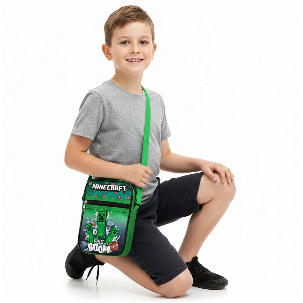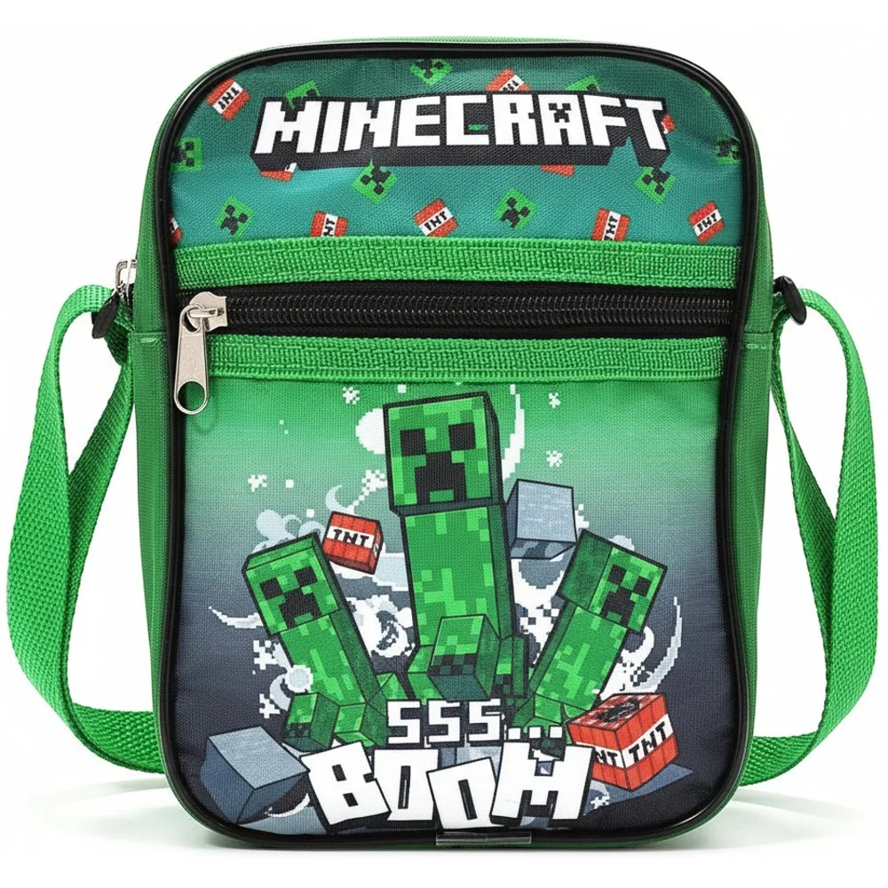 Crossbody kabelka Minecraft s motivem Boom a obrázky Creeperů v zeleno-černém designu. Nabízí jednu hlavní komoru a přední kapsu, oboje se zapínáním na zip. Díky nastavitelnému popruhu se snadno přizpůsobí malým i odrostlejším hráčům Minecraftu a stane se jejich skvělým společníkem na každý den.