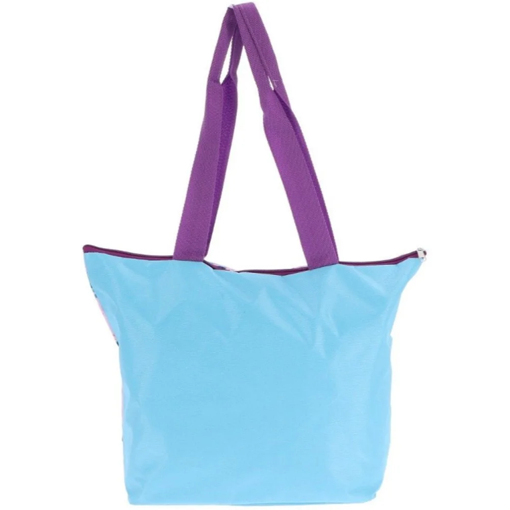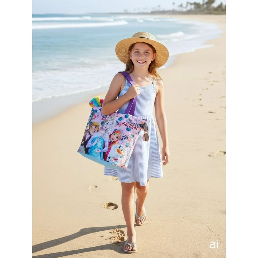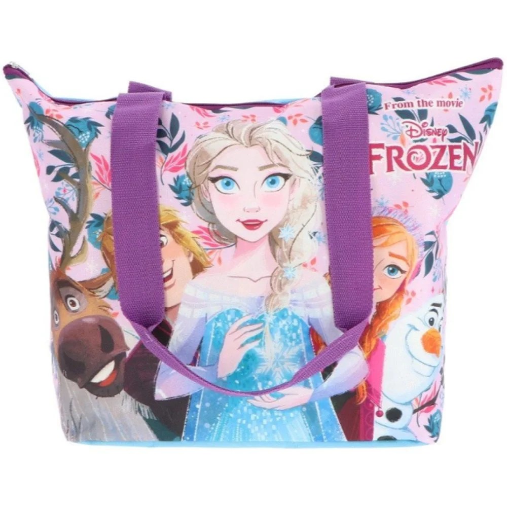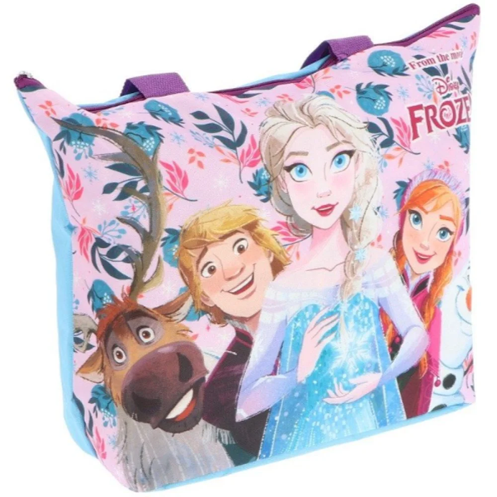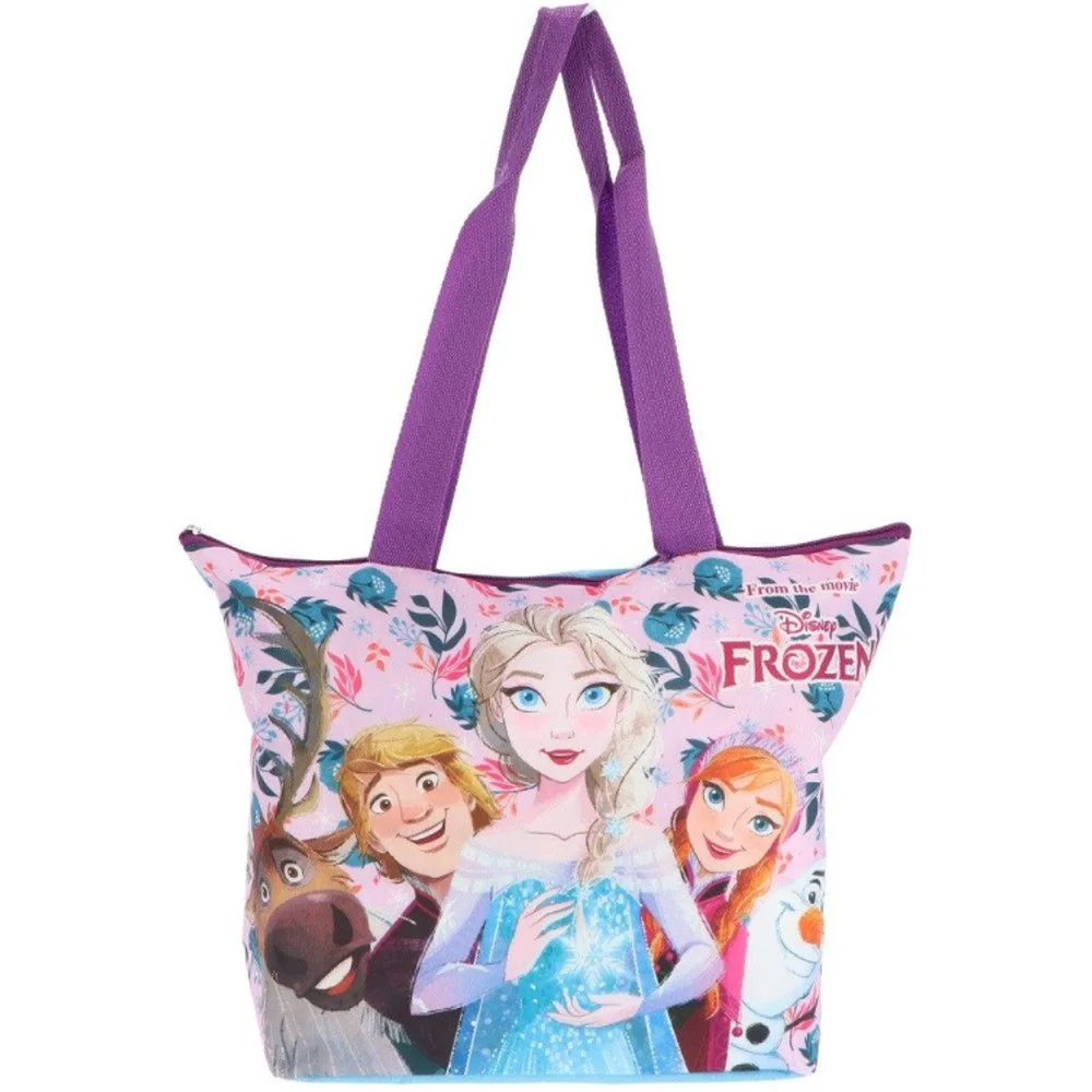 Plážová taška Frozen s obrázkem přátel z Ledového království. Má jednu hlavní komoru s malou vnitřní kapsičkou, obě se zapínáním na zip, a dvě pevná ucha pro nošení přes rameno nebo v ruce.
