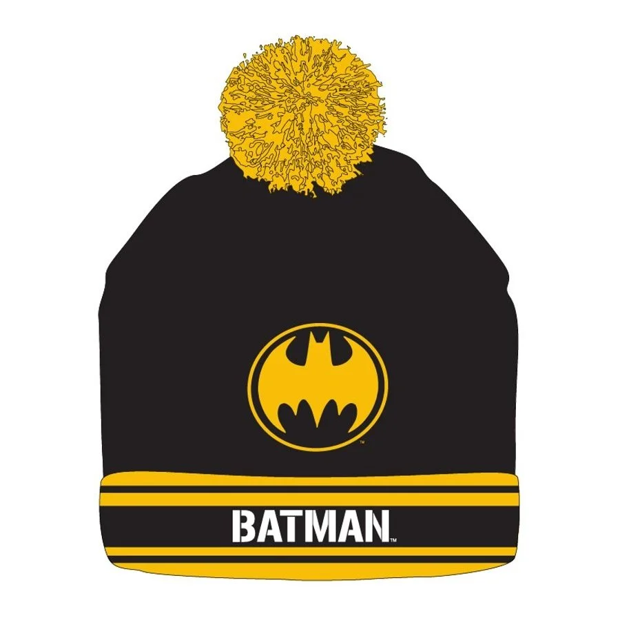 Dětská teplá čepice s bambulí Batman. Čepice je vyrobená z hřejivého akrylového zdvojeného úpletu - z vnější strany černého se žlutými pruhy, z vnitřní strany jednobarevného žlutého. Z přední strany čepici zdobí nášivka se znakem Batmana a výšivka s jeho jménem. Bambule je černo / žlutá.