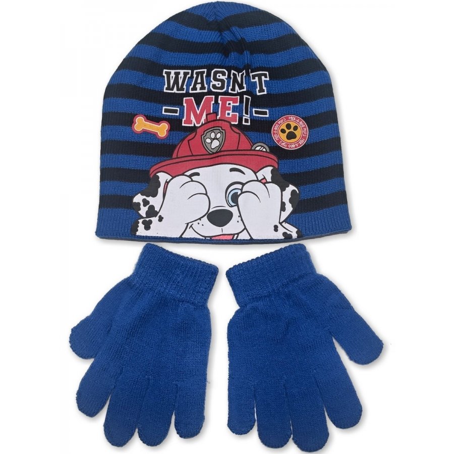 Souprava dětské teplé čepice a prstových rukavic Tlapková patrola - Paw Patrol. Čepici zdobí obrázek hasiče Marshalla a nápis Wasn't me, což je nejčastější výmluva, v překladu Já jsem to nebyl. Čepice je vyrobená z hřejivého akrylového zdvojeného úpletu v modro / černé, nebo červeno / šedé barevné kombinaci - viz výběr barvy a velikosti níže. Rukavice jsou vyrobeny z 80% hřejivého akrylu, 19% odolného polyesteru a 1% pružného elastanu a barevně vždy korespondují s dominantní barvou čepice, jsou tedy modré, nebo šedé.