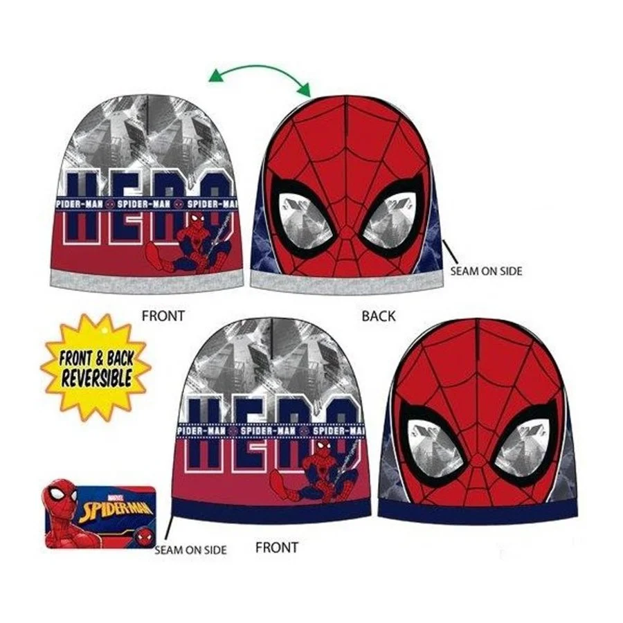Oboustranná dětská zimní čepice Spider-man - MARVEL - motiv Hero. Z přední strany ji zdobí motiv masky Spidermana. V očích se mu odráží pohled na město, které chrání. Stejné město je i na druhé vnější straně čepice, kde je doplněno nápisem Hero (česky hrdina). Vnitřní část a spodní lem čepice tvoří úplet šedé, nebo černé barvy - viz výběr barvy a velikosti níže. Svrchní potištěná část je vyrobena z polyesteru, vnitřní úplet je ze 70% hřejivý akryl, ze 30% odolný polyester.