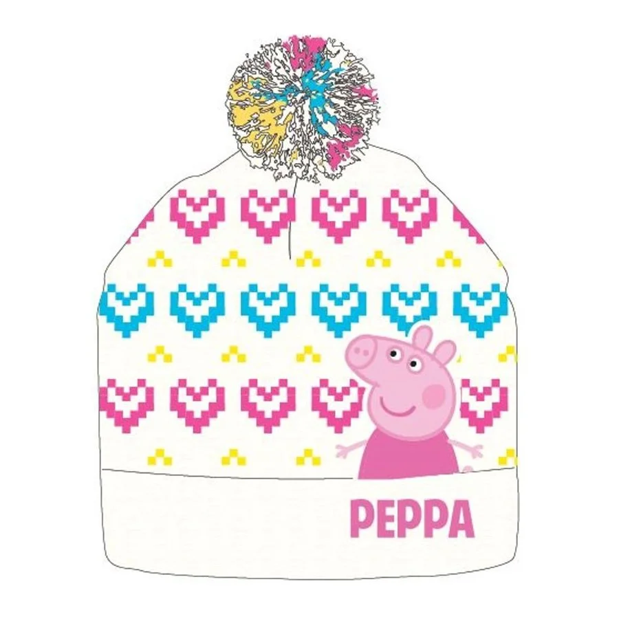 Dětská teplá čepice s bambulí Prasátko Peppa. Čepice je vyrobená z hřejivého a pružného akrylového zdvojeného úpletu krémové barvy s růžovými a tyrkysovými srdíčky. Navíc ji zdobí nášivka s obrázkem prasátka Pepiny a výšivka s jejím jménem Peppa. Vše doplňuje pestrobarevná bambule.