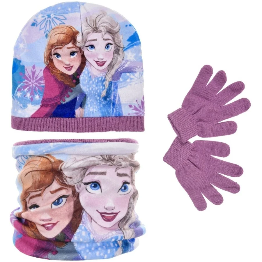 Souprava zimní čepice, pletených rukavic a nákrčníku Ledové království - Frozen. Čepici i nákrčník zdobí obrázek princezen Anny a Elsy. Svrchní část čepice a nákrčníku jsou vyrobeny z odolného polyesteru s potiskem, vnitřní část je vyrobena z hřejivého akrylového úpletu. Tuto sadu nabízíme ve světle modré, nebo fialové barvě úpletu s velikostí čepice 52, nebo 54. Velikost nákrčníku a rukavic je univerzální - dětská.