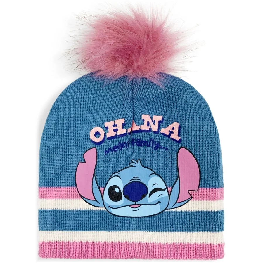 Dětská úpletová čepice s bambulí Lilo & Stitch - motiv Ohana, což v havajském jazyce znamená rodina a blízcí přátelé. Čepici zdobí obrázek Stitche, třpytivý nápis Ohana a střapatá bambule.