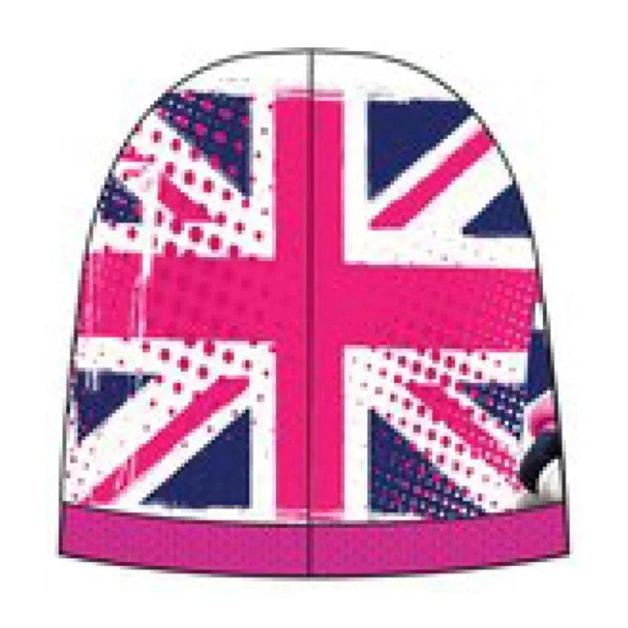 Dívčí teplá čepice Minnie Mouse - Disney. Na přední straně je obrázek myšky Minnie, na který navazuje potisk zadní strany s motivem anglické vlajky. Spodní lem a vnitřní pletená část čepice je růžová.