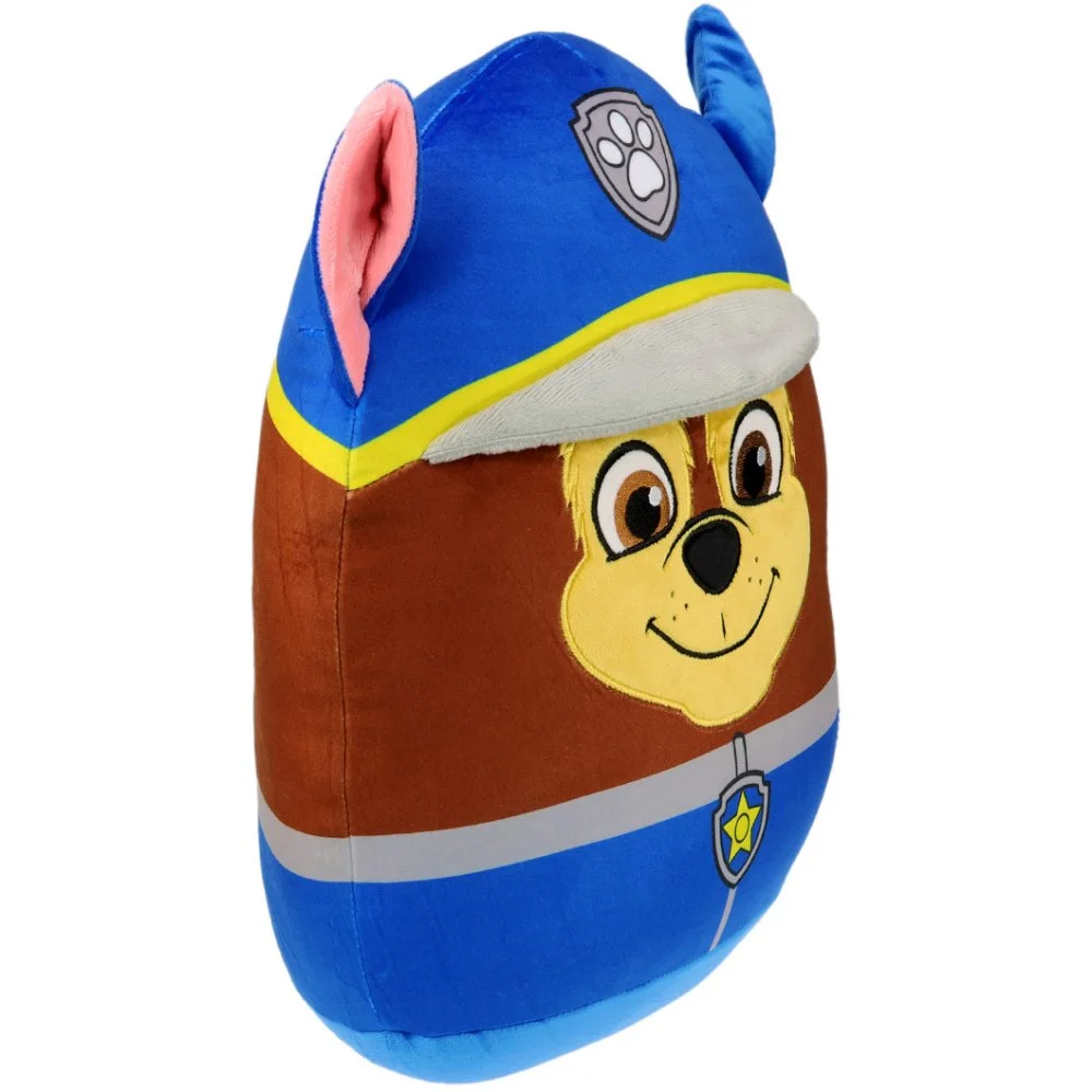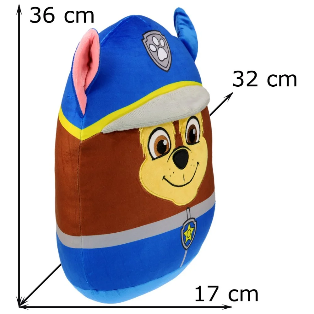 Tvarovaný 3D squish polštář Paw Patrol - motiv policista Chase. Super měkký, elastický a mačkací plyšový polštářek na mazlení, hraní nebo jako roztomilá dekorace do dětského pokojíčku. Rozměry jsou cca 36×32×17 cm.