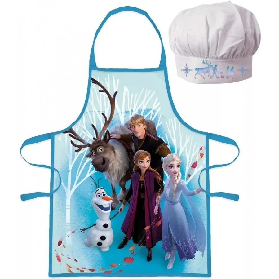 Set dívčí zástěry a kuchařské čepice Ledové království - Frozen - motiv Believe in The Journey - s obrázkem princezen Anny a Elsy s jejich kamarády Olafem, Kristoffem a Svenem. Zástěra je vhodná pro malé kuchařky, ale i do výtvarné výchovy, do keramiky, či jako pracovní zástěra k různým školním i mimoškolním pracovním činnostem. Tento kuchařský set je vhodný pro děti od 3 let. Lze jej prát při teplotě do 60°C.