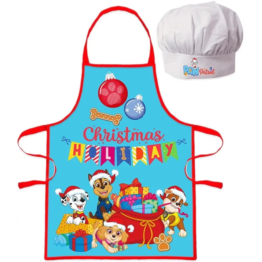Dětská souprava zástěry a kuchařské čepice Tlapková patrola - Paw Patrol s vánočním motivem. Zástěra je vhodná nejen pro malé kuchaře při pečení vánočního cukroví, do výtvarné výchovy, nebo do keramiky při vyrábění dárků, ale i k jakýmkoliv pracovním aktivitám po celý rok, protože děti Vánoce milují a rády si je připomenou třeba i v létě. Tento kuchařský set je vhodný pro děti 3 - 8 let. Výška zástěry je cca 52 cm, její šířka je cca 42 cm. Vše lze prát při teplotě do 60°C.